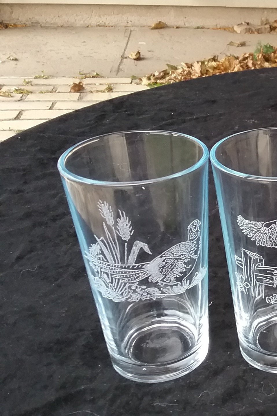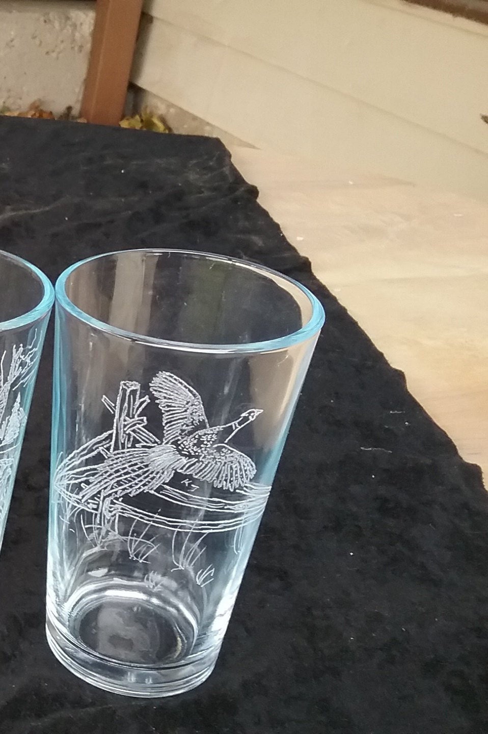 These glasses are pint size (16oz,) pub glasses that are 5.5" tall. I hand engrave the above designs on the wildlife set. I also do the same design on whiskey glasses that are also listed on my website.