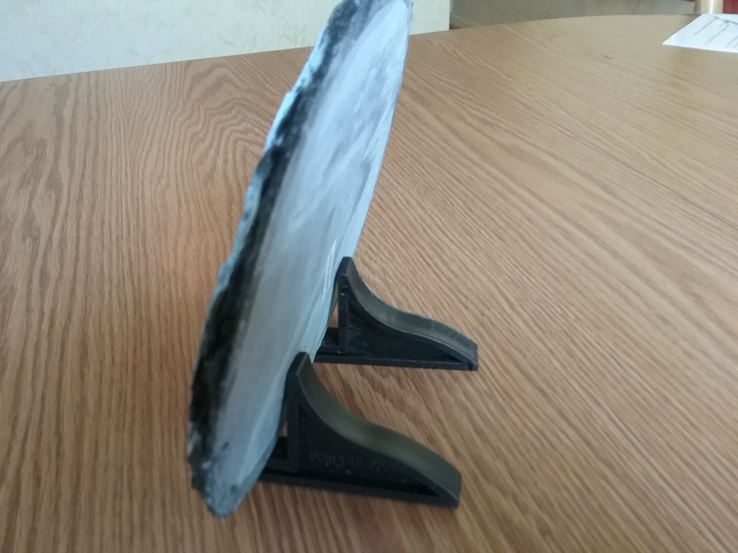 The picture shown is an oval measuring 5 12" x 8'. Also, available is a rectangle measuring 5 1/2" x 7 1/2". Both come with black plastic feet so it will sit upright on most surfaces and with a gift box.